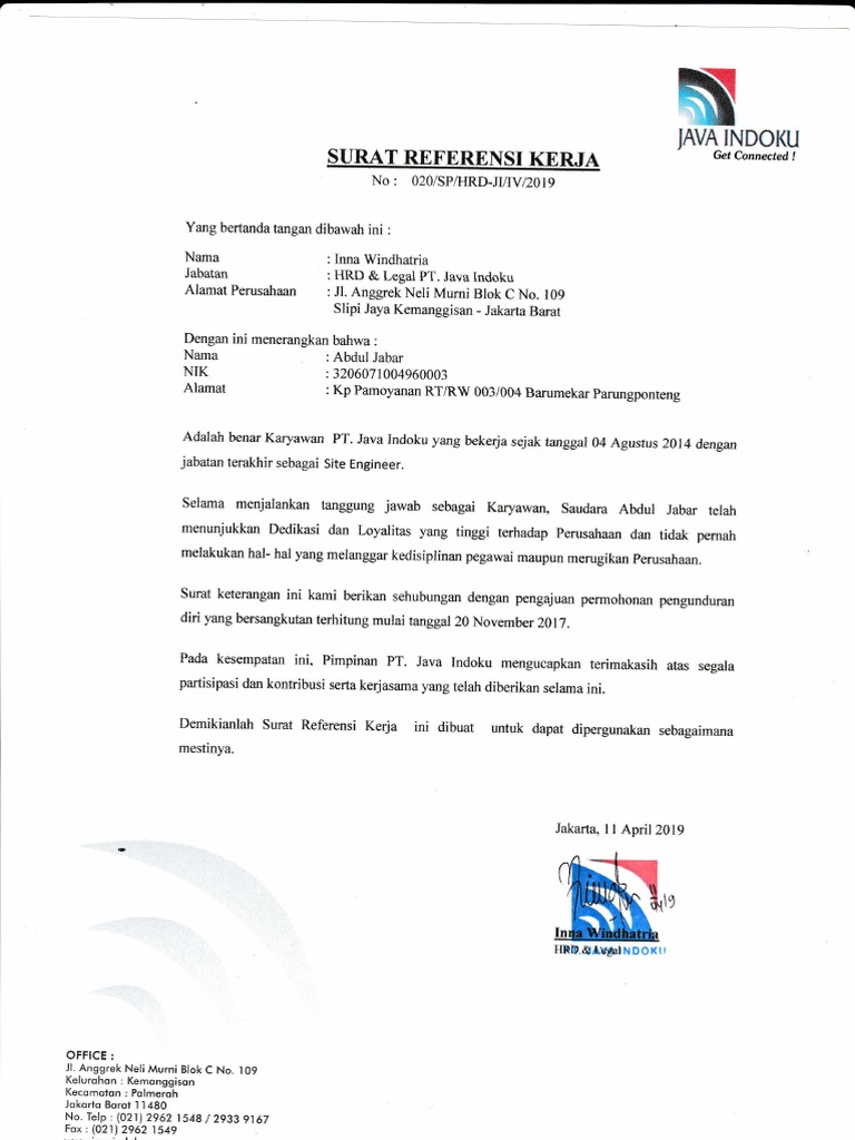 | Tanggal pembuatan Surat Keterangan Kerja Pdf: April 2019 |