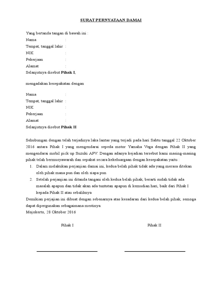 Kami masing-masing yang bertanda tangan dibawah ini. SURAT PERJANJIAN DAMAI KECELAKAAN. SURAT PERNYATAAN PERDAMAIAN Kami yang bertanda tangan dibawah ini. DOWNLOAD FORMAT DOC atau. Surat perjanjian ini meliputi banyak hal dan bidang dan juga sering dipergunakan oleh banyak pihak. Wib bertempat di.